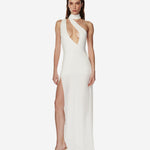 A quiet statement in sculpted simplicity. The Rêve Dress skims the body with a fluid, matte crepe that moves with subtle elegance. The halter neckline frames the shoulders and lifts the collarbones, while the open back invites shadow and air. A long, clean silhouette that flatters without effort unlined, unpadded, unmistakably sensual.